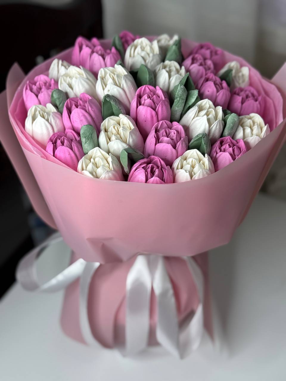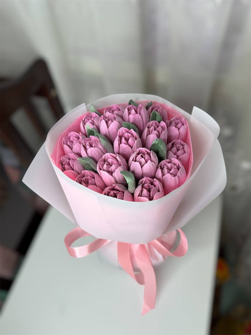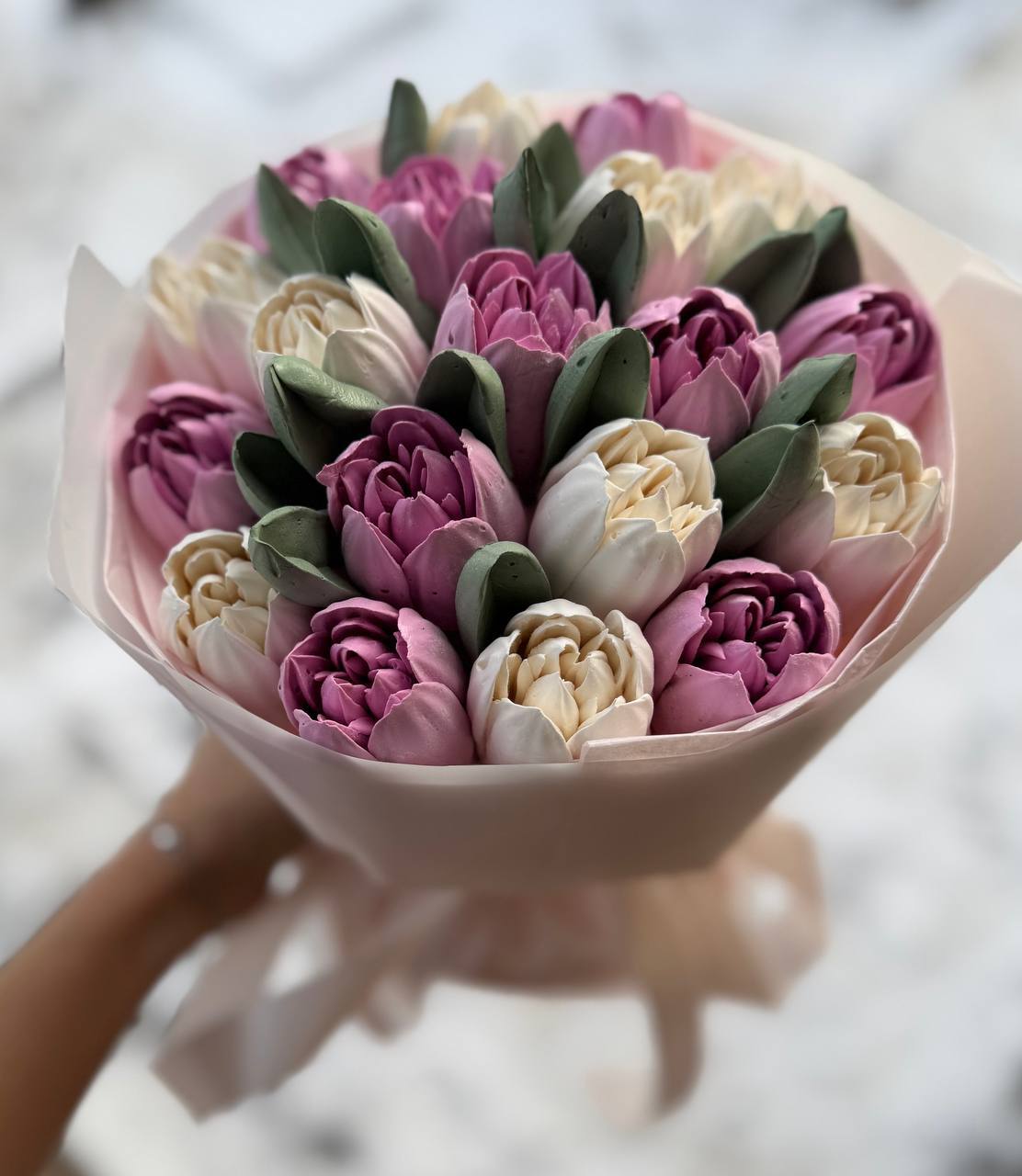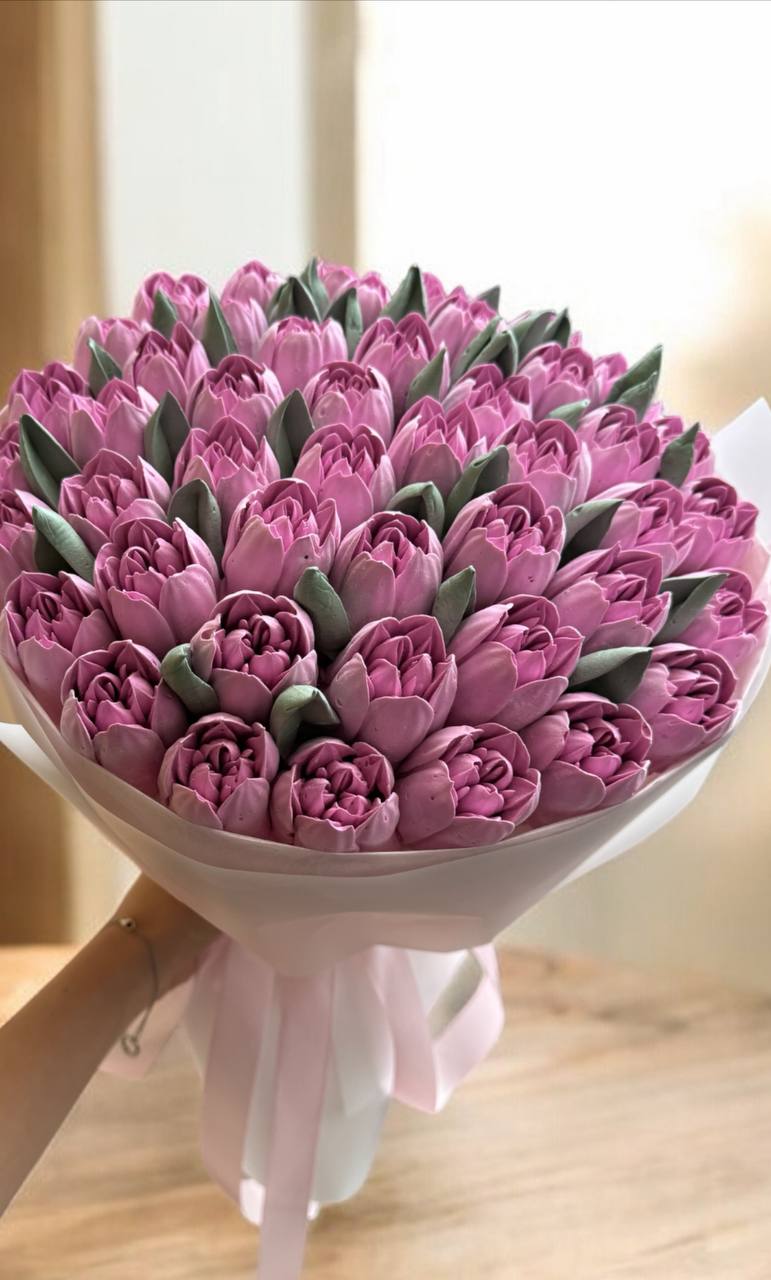 Романтичний букет із рожевих зефірних тюльпанів. Виглядає ніжно та акуратно. Ідеальний подарунок для приємного сюрпризу.