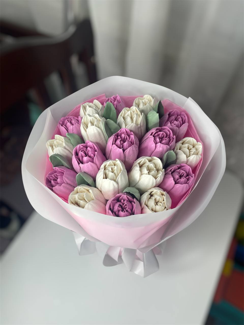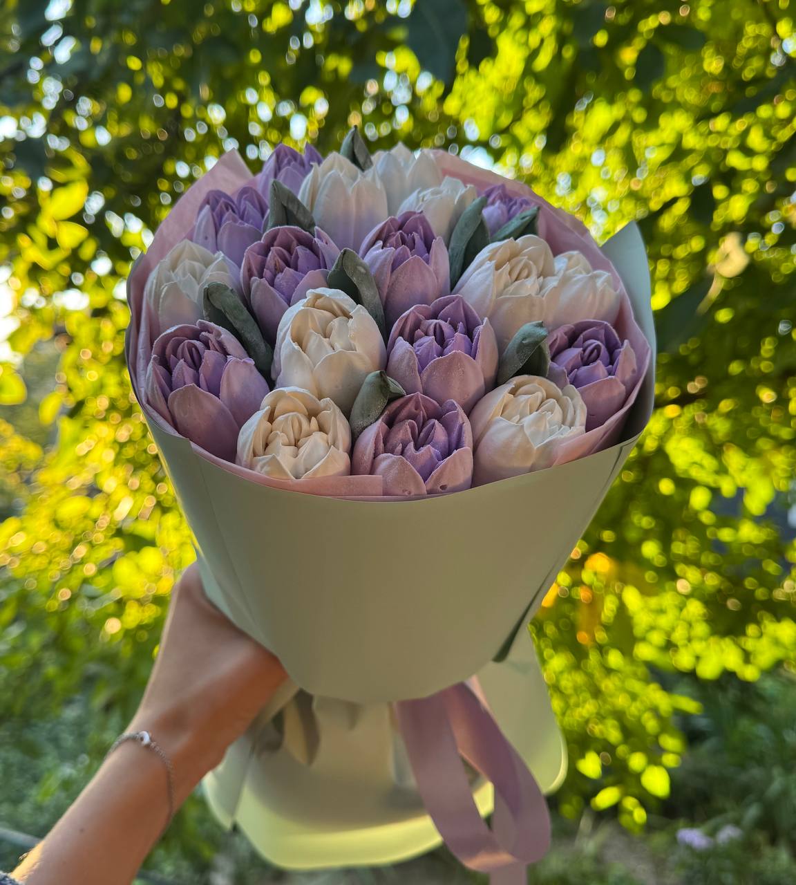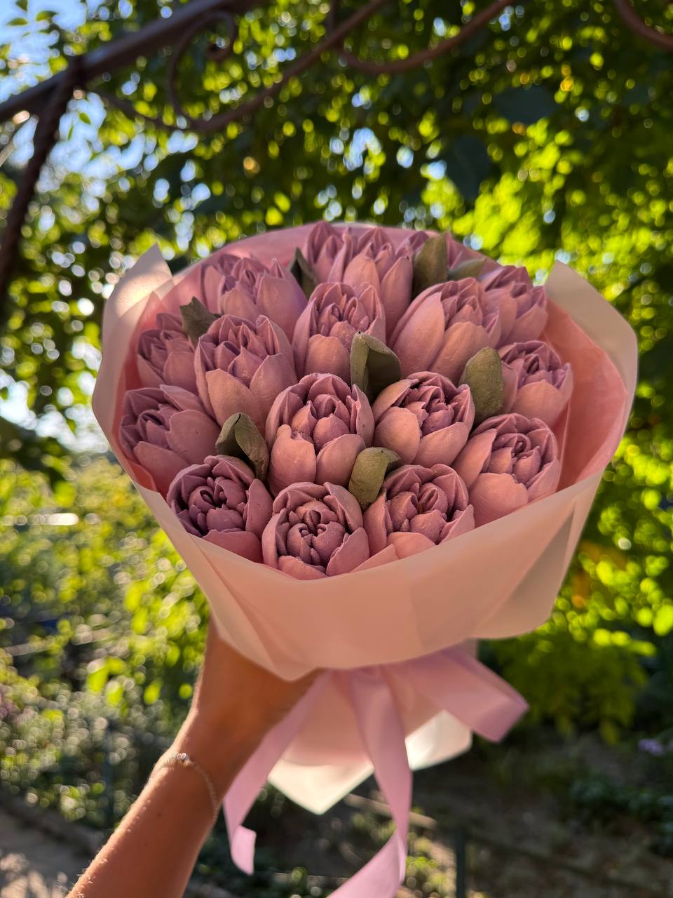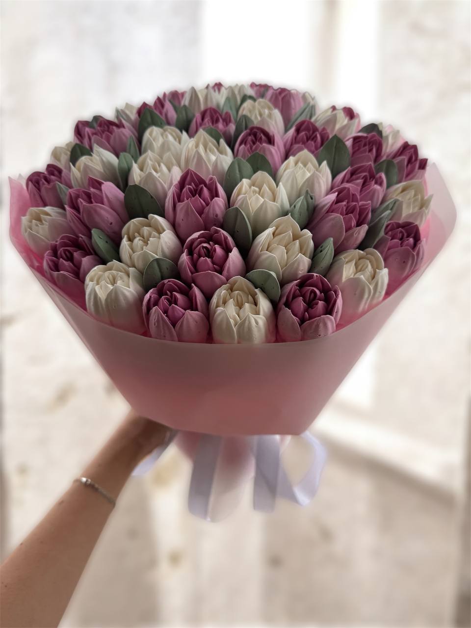 Романтичний букет із рожевих зефірних тюльпанів. Виглядає ніжно та акуратно. Ідеальний подарунок для приємного сюрпризу.