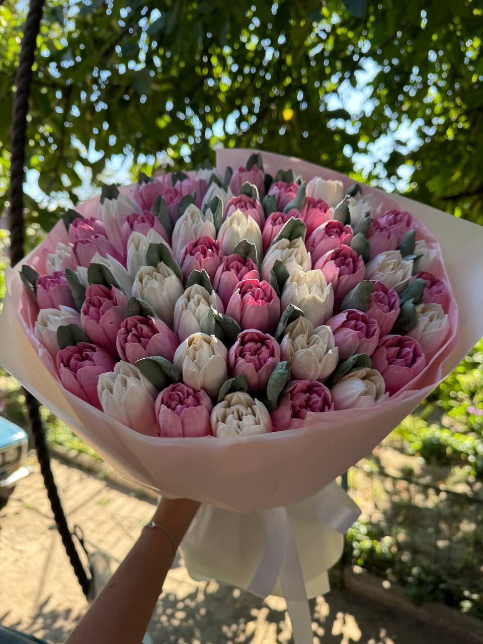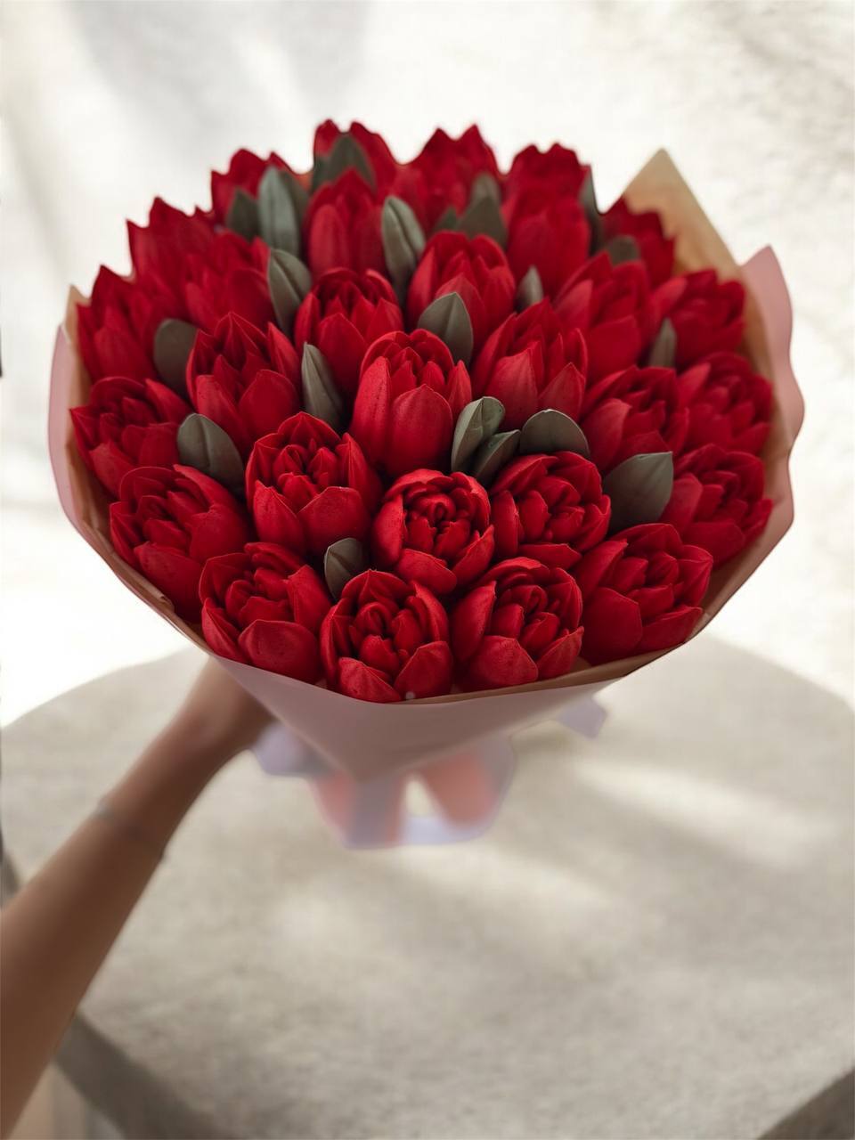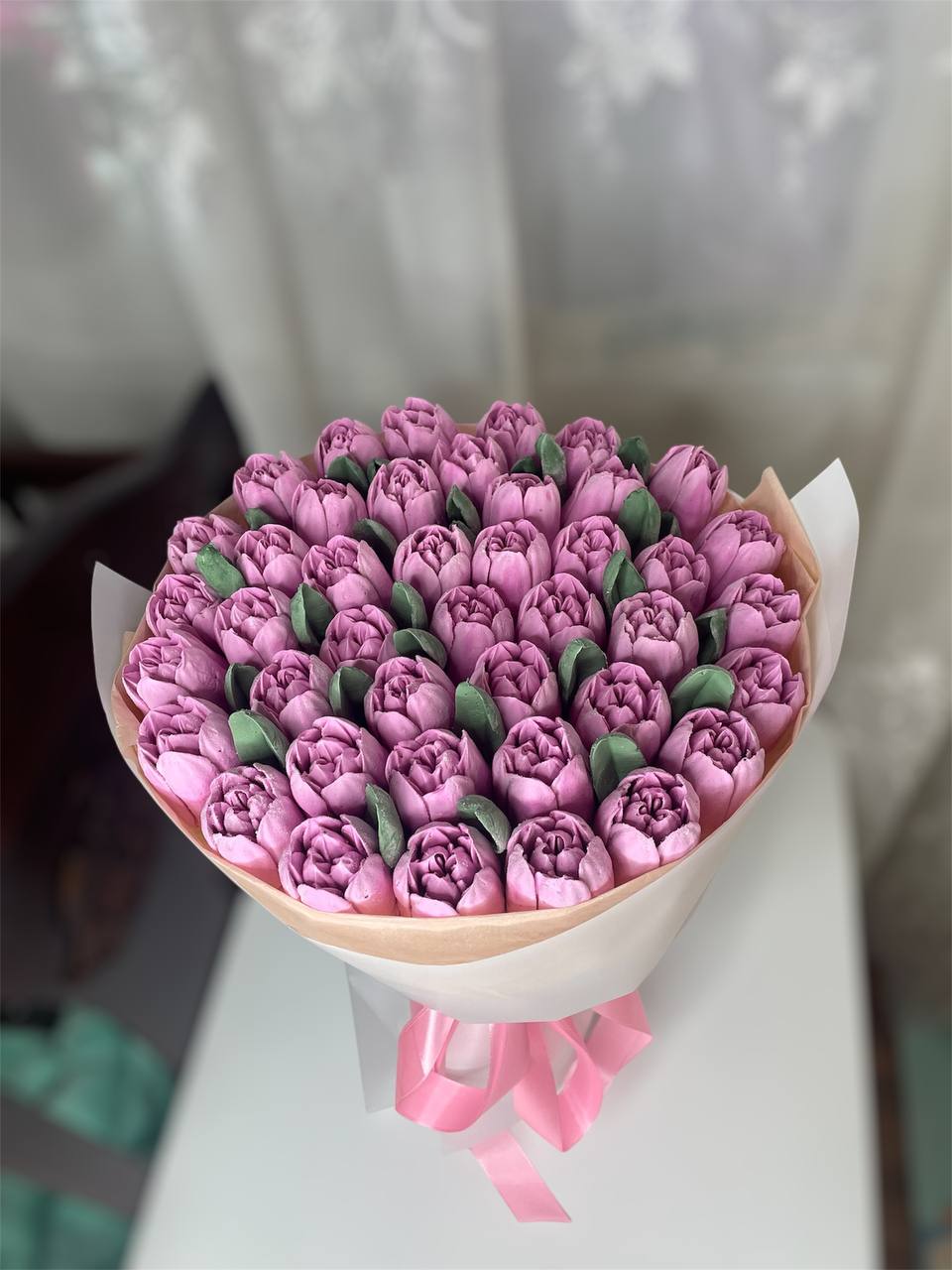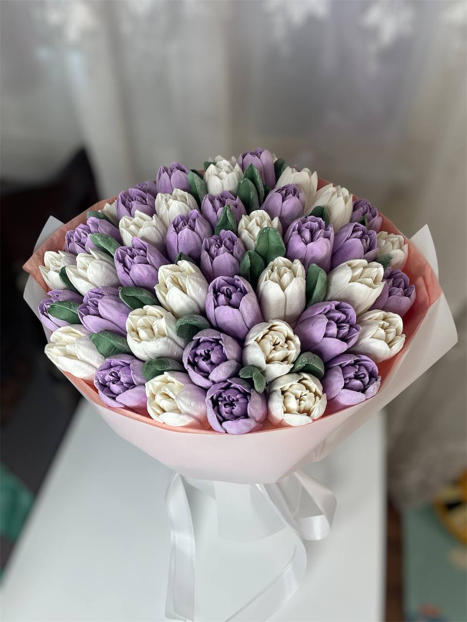 Романтичний букет із рожевих зефірних тюльпанів. Виглядає ніжно та акуратно. Ідеальний подарунок для приємного сюрпризу.