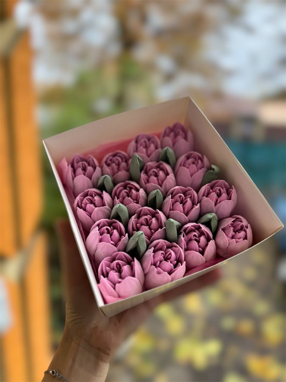 Акуратна коробочка з зефірними квітами — стильний і смачний сюрприз. Виглядає естетично та зручно для дарування. Ідеально, коли хочеться чогось особливого.