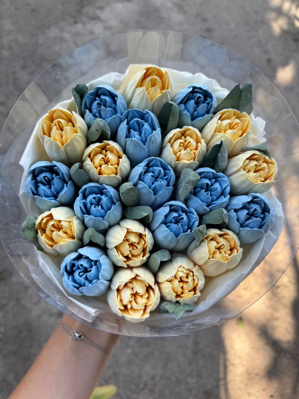 Поєднання різних кольорів створює ефект живого весняного букета. Солодкий подарунок, який точно запам’ятається.