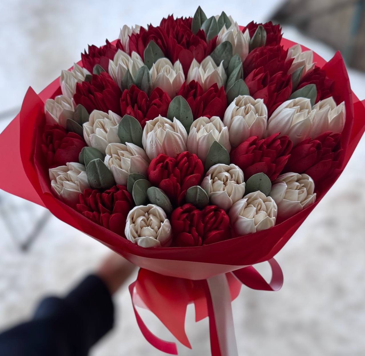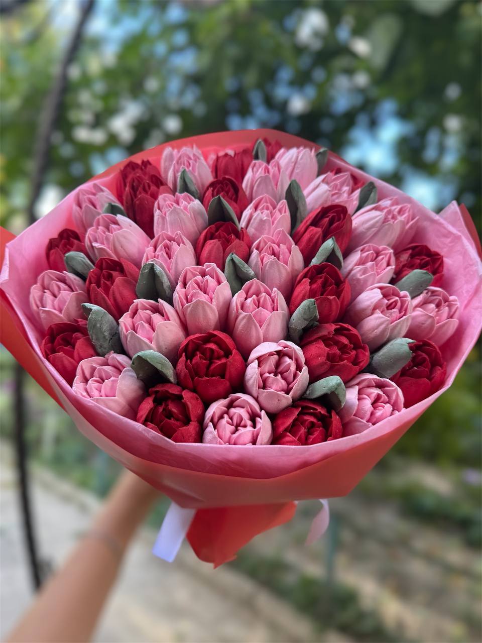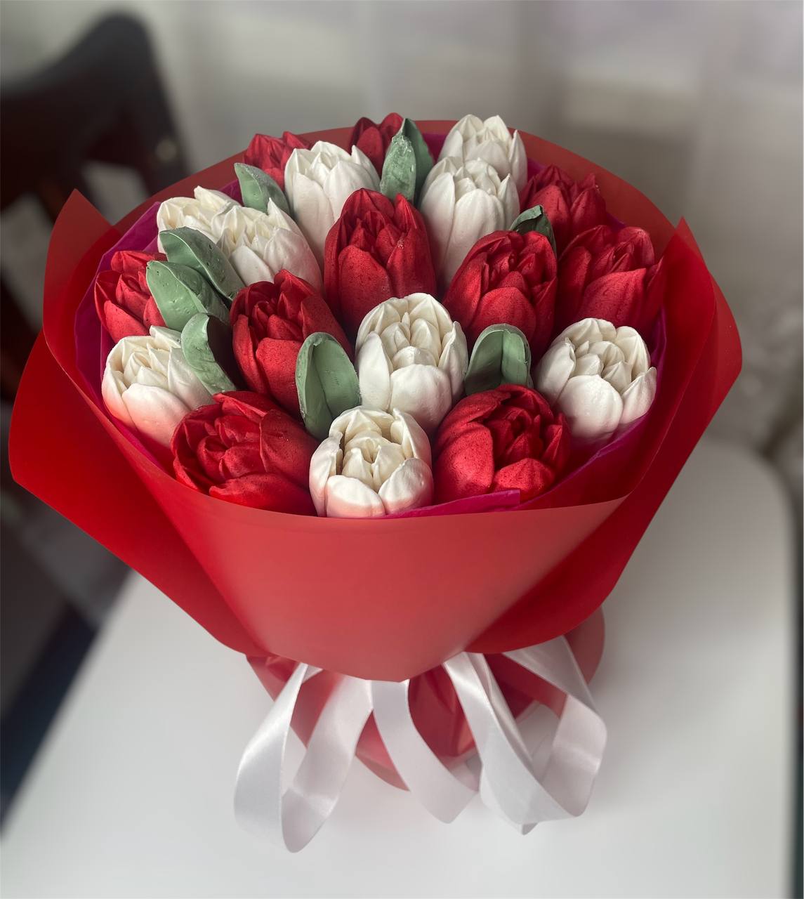 Яскравий зефірний букет, що говорить про почуття без слів. Червоні тюльпани виглядають ефектно та одразу привертають увагу. Ідеальний солодкий подарунок для особливого моменту.