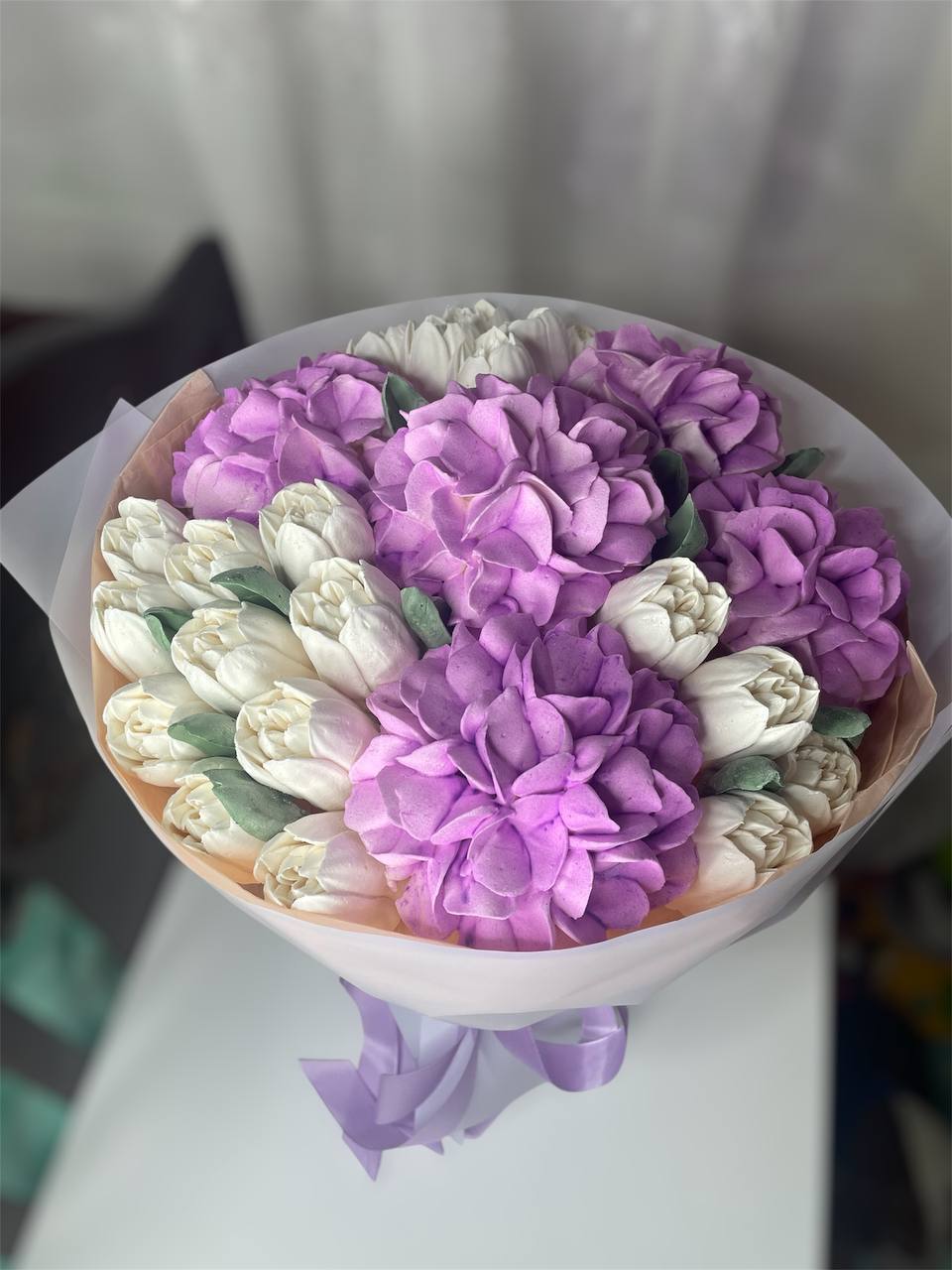Мікс зефірних квітів різних форм і кольорів. Букет виглядає об’ємно та дуже святково.